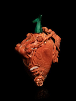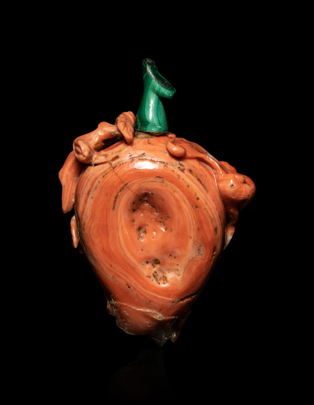 the bottle in the shape of a peach, carved to the side in high relief depicting a bat, a white worm resting atop flowering branches, together with a malachite stopper.