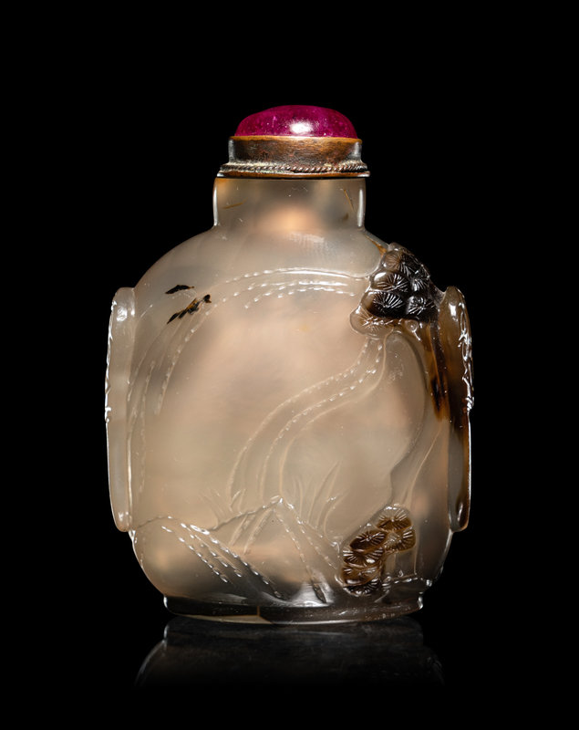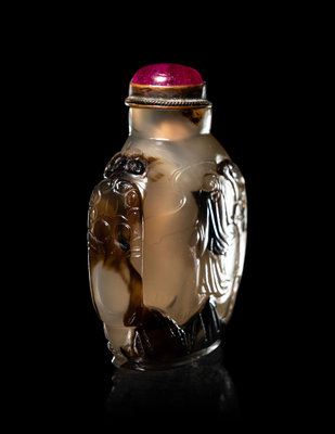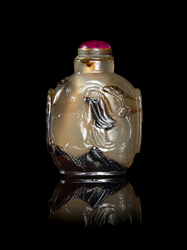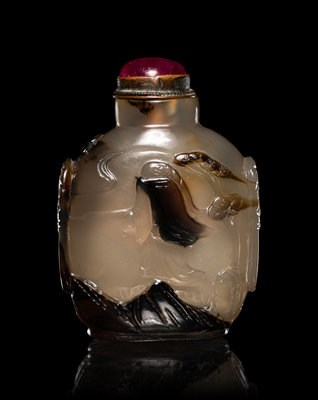 清晚期 灰瑪瑙巧雕山水鼻煙壺