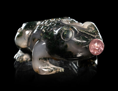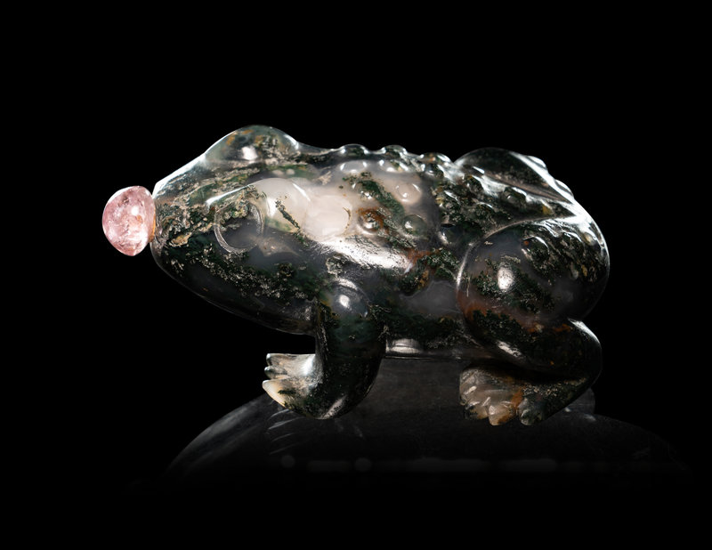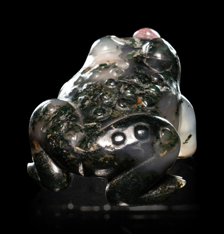 the first example of large rounded square form, flanked by a pair of mock-ring handles, together with an amber stopper; the second in the shape of a recumbent frog, together with a rose quartz stopper.