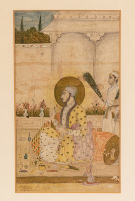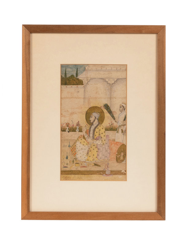 depicting a prince with a halo seated against a bolster smoking a hookah and holding a flower, on the terrace of a pavilion, behind him an attendant waves a morchal, decorative pots and flowers in the foreground; inscription in lower left corner, framed.