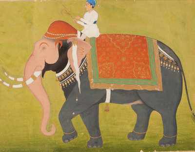 The elephant facing left with pink trunk and ear, white and gold tusks, with a decorative saddle-cloth in orange, green and gold, white tassel, and bells at his girth and neck, the mahout wears a white jama with a blue turban and holds a golden goad, pale green background. Framed.