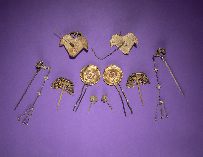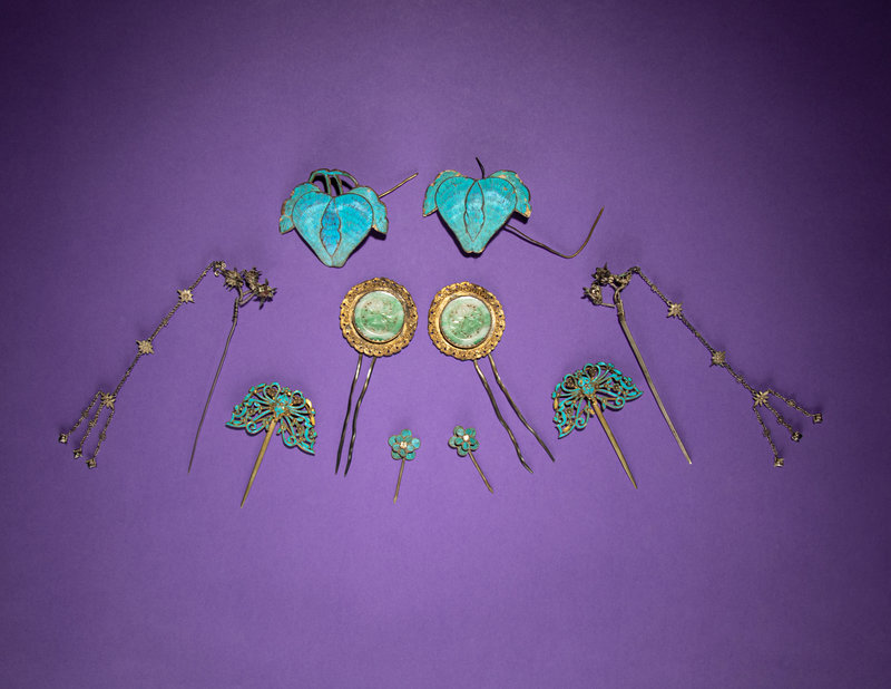 Five Pairs of Kingfisher Feather and Jadeite Embellished Hairpins