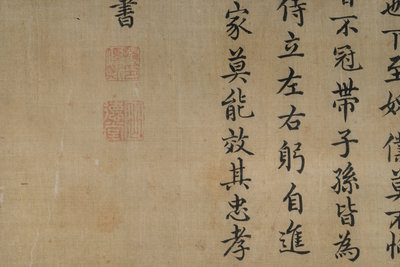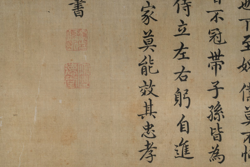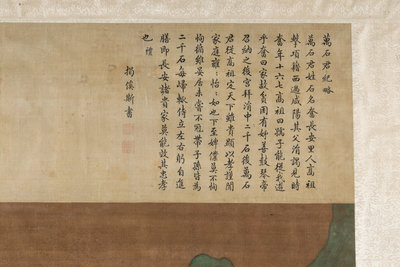 題跋:萬石君紀略。萬石君姓石名奮,長安里人。高祖击项籍,過咸陽。其父涓謁見時,奮年十六七,高祖曰:孺子能從我游乎?奮曰:家故貧困,有姊善鼓琴。帝召納之后宮。拜涓中二千石,后萬石。君從高祖定天下,雖貴顯,以孝謹聞。家庭雍雍怡怡如也。下至婢僕莫不恂循。雖晏居,未嘗不冠帶子孫,皆爲二千石,每歸,轍侍立左右,躬自進膳。即長安諸貴家莫能效其忠孝也禮。揭傒斯書。