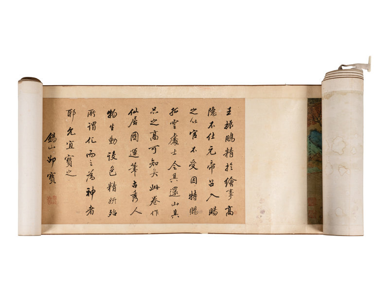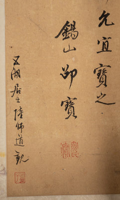 2. 陸師道(款),釋文:王振鵬精於繪事,高隱不仕。元帝召之,以官不受,因爲特賜孤雲處士,令其還山,其品之高可知矣。此卷作仙居圖,運筆古秀,人物生動,設色精妍,殆所謂化而之。為神者耶?允宜寳之。錫山▯寶。五湖居士陸師道觀。鈐印:彦氏宾、吕盦子