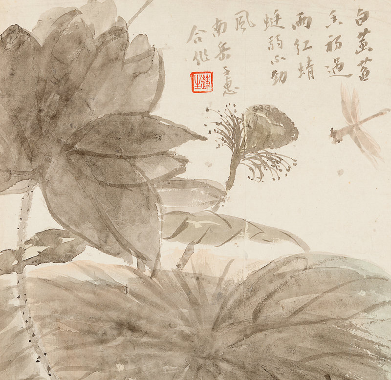 款識:白菡蕙香初遇雨,紅蜻蜓弱不禁風。南岳子惠合作。