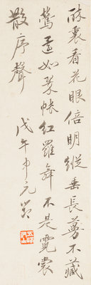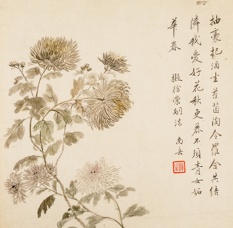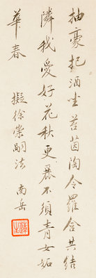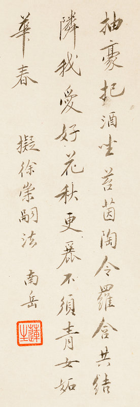 款識:抽豪把酒坐苔茵,陶令羅含共結隣。我愛好花秋更麗,不須青女妬華春。擬徐崇嗣法, 南岳。