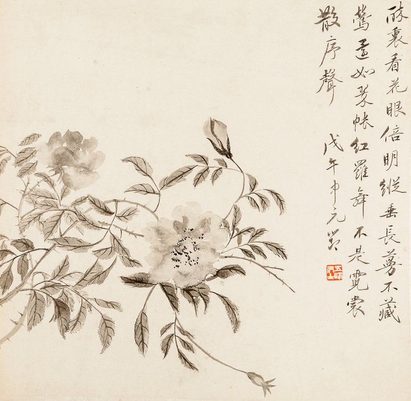 款識:醉裏看花眼倍明,縱垂長蔓不藏鶯。還如翠帳紅羅舞,不是霓裳散序聲,戊午(1858)中元節。