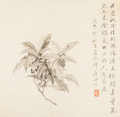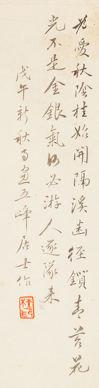 款識:為愛秋陰桂始開,隔溪幽徑鎖青苔。花光不是金銀氣,何必遊人逐隊來。戊午(1858)新秋雨窗,五峰居士作。