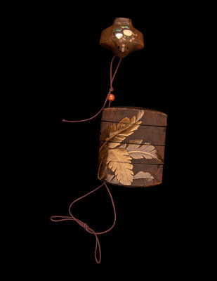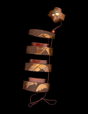 decorated with lacquered leaves upon a natural wood ground, the associated netsuke in the form of a bird with inlays.