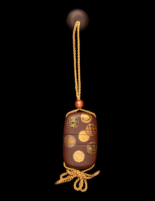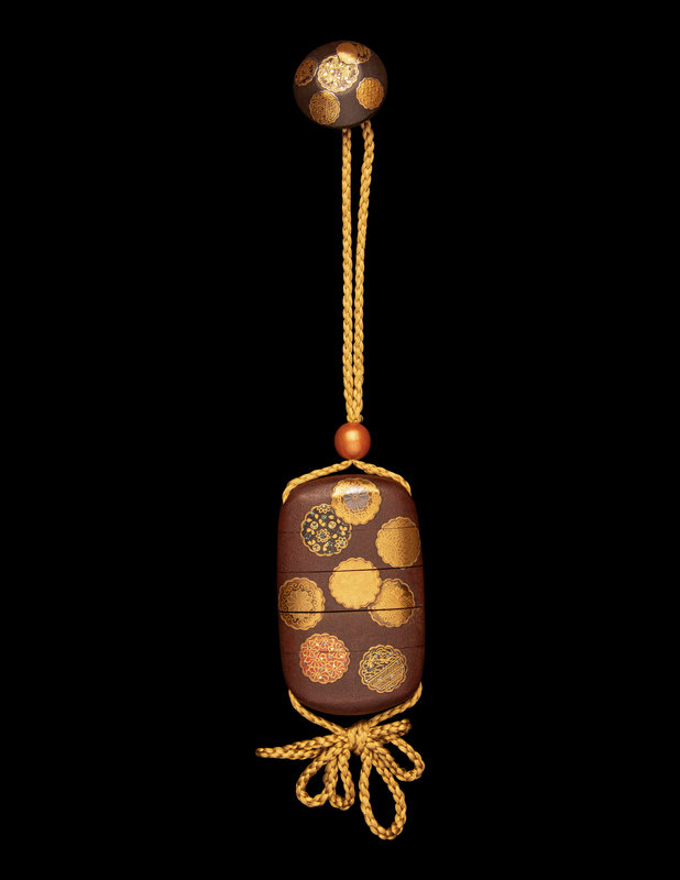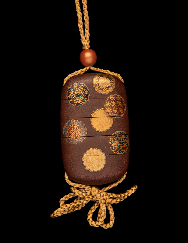 of roughened brown lacquer simulating leather, decorated with flower heads in gold, silver, black and red lacquer, the interior of nashiji, unsigned; together with an ensuite netsuke and an orange lacquer bead-form ojime.