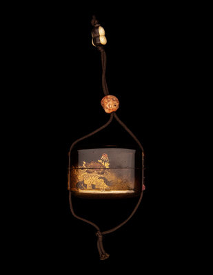 the horizontal rectangular inro decorated in gold, silver, red and brown lacquer depicting shishi lions beside plants, against a dark brown ground, the interior of nashiji, unsigned; together with a carved hardstone ojime and a carved bone gourd-form netsuke.