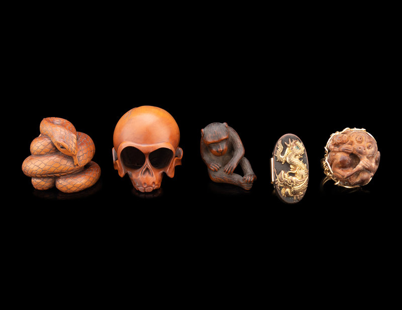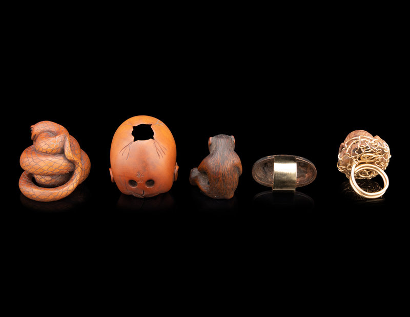 three carved wood netsuke depicting a snake, skull, and monkey; a kashira depicting a dragon mounted as a ring, and a monkey netsuke mounted as a ring.