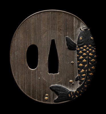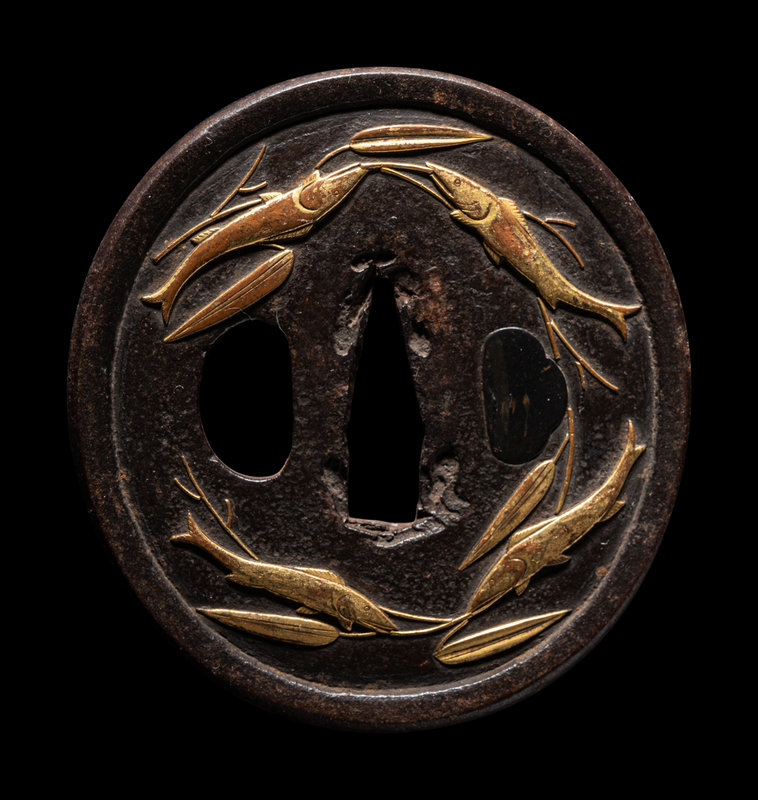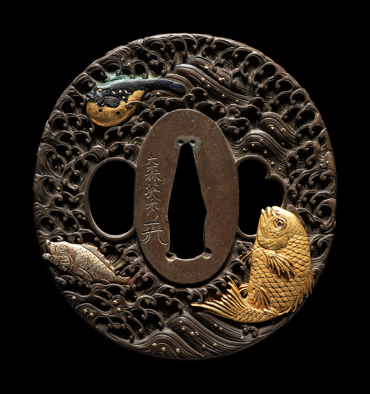 the first a gilt copper inset iron example, decorated with several fish, unsigned; the second a bronze example with gold and silver inlaid depicting fish above crashing waves, signed Omori Teruhide (1730-1798), with a kao, 大森英秀 (花押); the third a bronze example inlaid with gold and shakudo depicting a carp, unsigned.