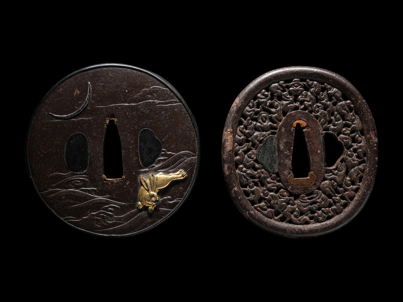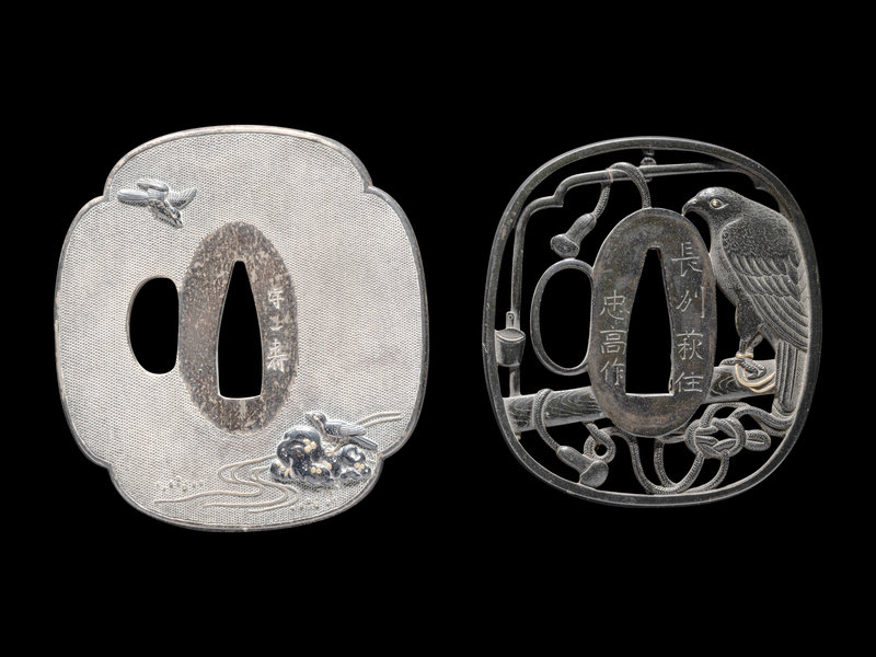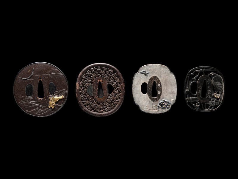the first a circular iron example, decorated in gold and bronze showing a rabbit underneath the moon, with chiselled clouds and waves, the rim mounted with bronze; the second an open worked iron example decorated with numerous monkeys; the third a gilt decorated shakudo example with opened worked decoration depicting an eagle tied to its perch, signed 長州萩住忠高作; the fourth of mokko form, silvered metal nanako, inlaid with shakodu and gilt, showing birds and rockery, signed 守一壽.