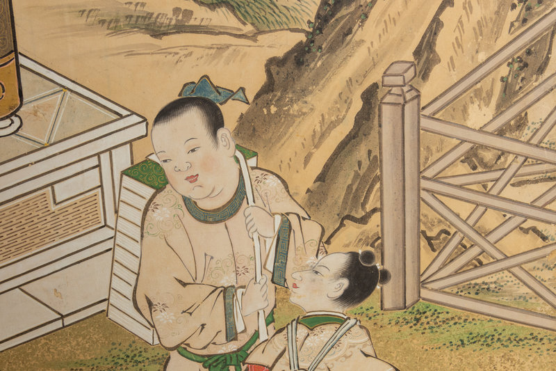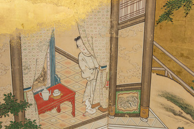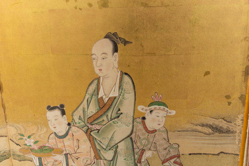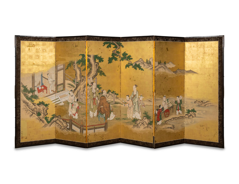 six-fold floor screen, ink and color on gold leaves, depicting Chinese scholars and their attendants in a garden with further mountains in distance.