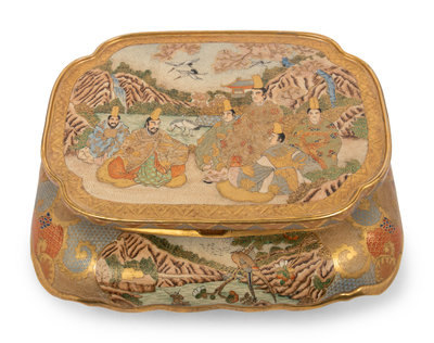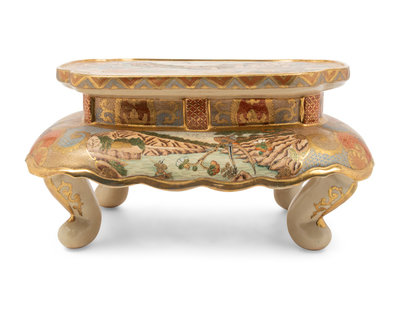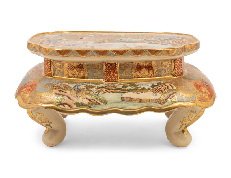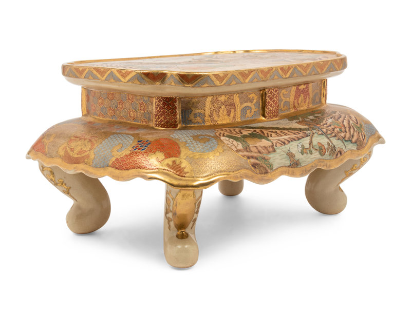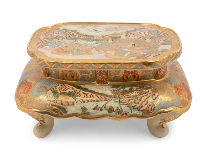 of waisted, two-tiered form, having a quatrefoil surface and a skirt atop four flared legs; the surface depicting officials seated within a mountainous landscape.