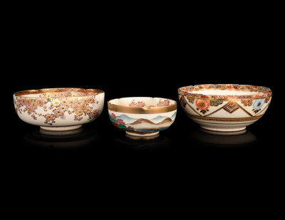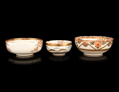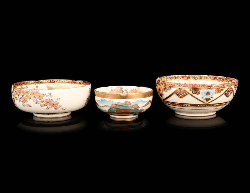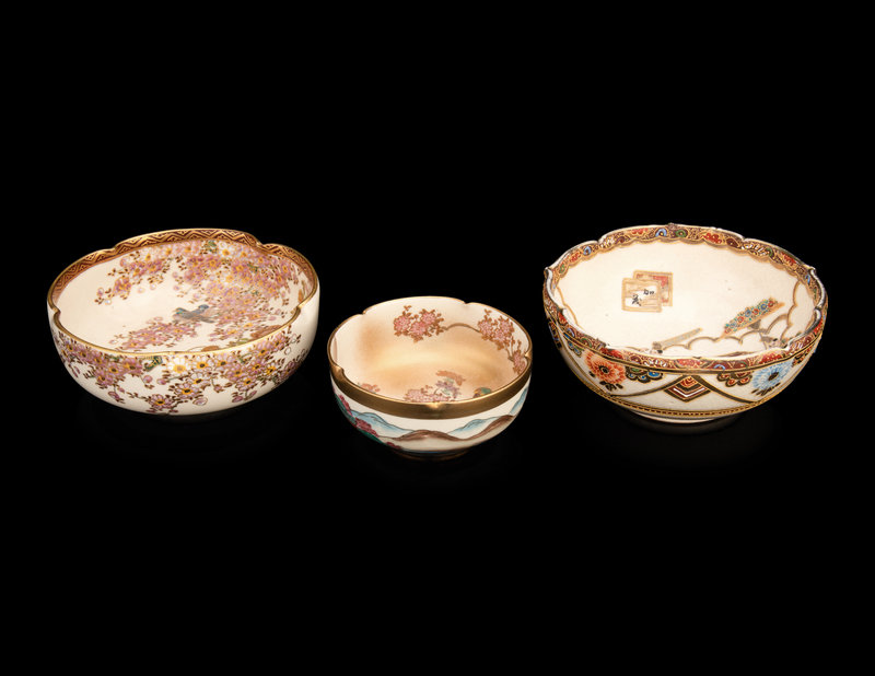 comprising a five-lobed bowl decorated with flowers and birds, a six-lobed bowl with everted points depicting a figural scene, and a small five-lobed bowl decorated with flowers and butterflies.