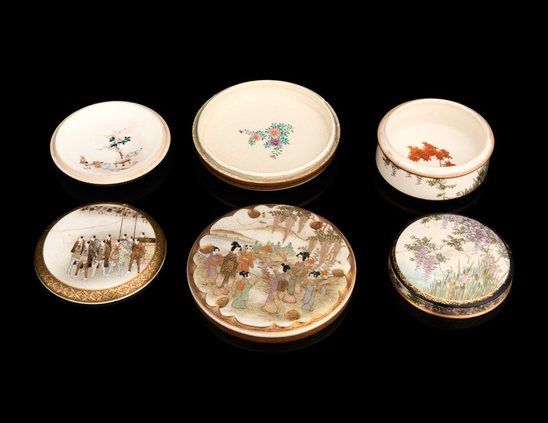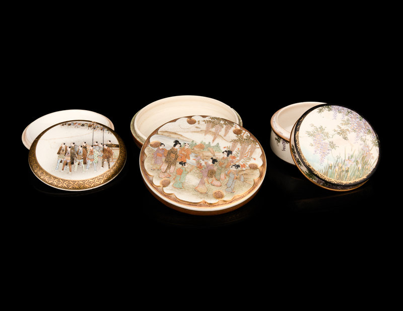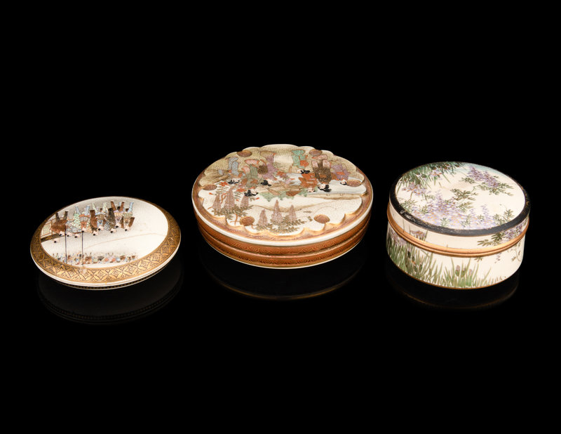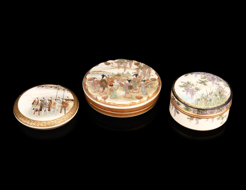 each of rounded form, two depicting figural scenes, the third decorated with flowers.