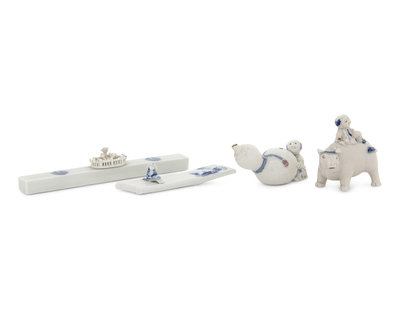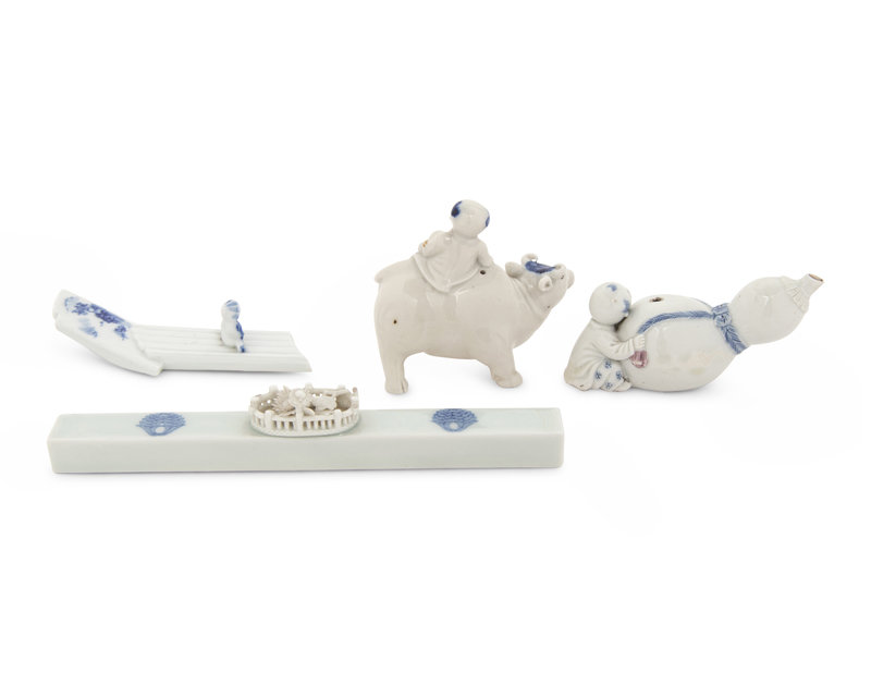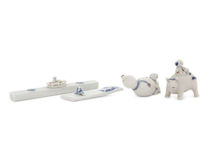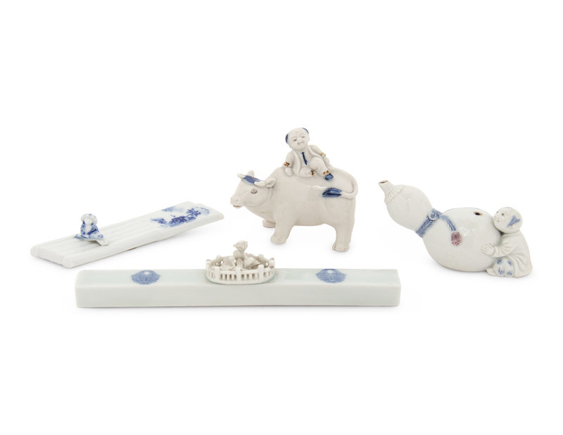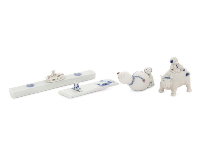 comprising a brushrest in the shape of a raft with a child seated atop; a rectangular paper weight molded at the center with a small fenced garden; a gourd-form water dropper and a figural group of a child on a buffalo.