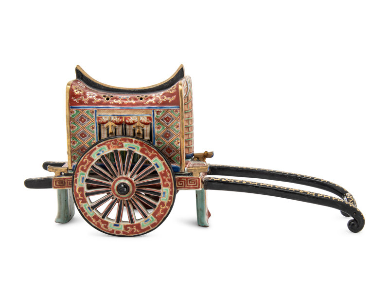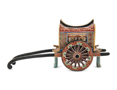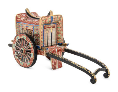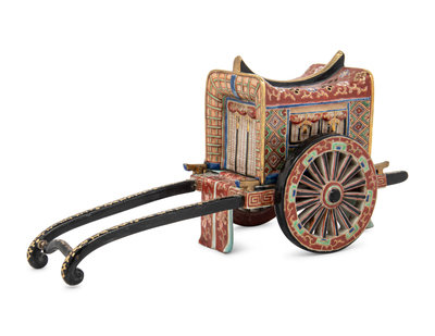 in the form of a two-wheeled cart, having an upturned, reticulated roof; the gilt and polychrome decoration representing shaded windows and geometric and floral motifs.