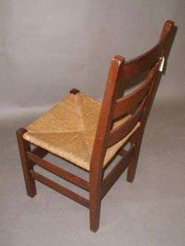 Of ladderback form with three horizontal slats, rushed seat, red decal and original finish, repair to one stretcher, h: 35 in.