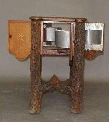 With quadralobate walnut top on four hinged doors, each with lined aluminum compartments and inlaid with star and banded line, the legs of pierced tropical wood, h: 26.75, top: 15.75 square in.