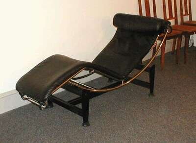 With tubular chrome frame and rubber supporting a black leather cushion and pillow on a black cast metal frame, l: 66 in.