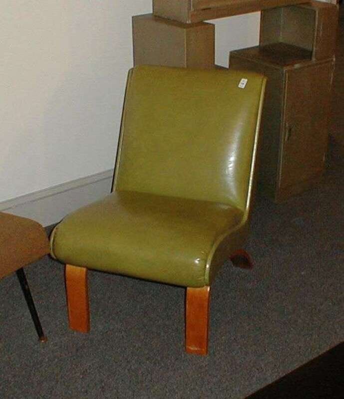 With contoured seat and back of olive green vinyl on two molded plywood legs, h: 30.5, w: 21.5 in.