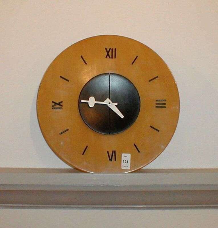 Circular dish form of maple with black circular center, white hands and black Roman numerals, decal to reverse, dia: 14 in.