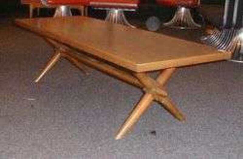 With rectangular top on X base with doweled legs/stretcher, decal, h: 16, w: 21, l: 58 in.
