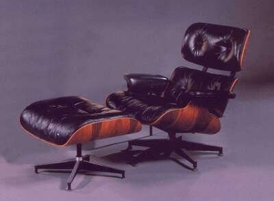 Contoured rosewood shells, black leather, Herman Miller black labels to both, button torn on ottoman.
