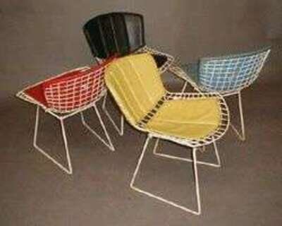 White coated wire form each with different colored vinyl seat pad & back (blue, red, yellow, black), cloth tags, one with loose joint, h: 29 in.