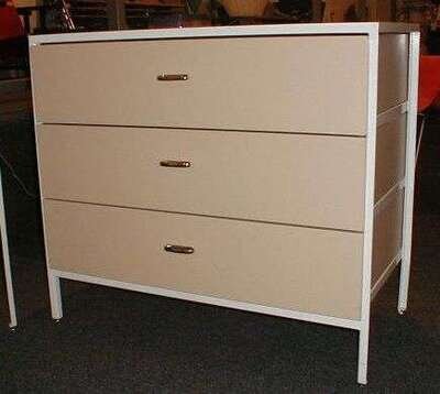 White laminate top above three drawers with tan fronts and sides, labeled, drawers nicely repainted, h: 29.5, w: 33.5, d: 17 in.