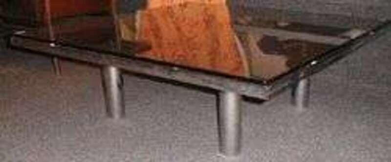 With heavy chromed steel base and square smoky glass top, h: 15, 45 square in.