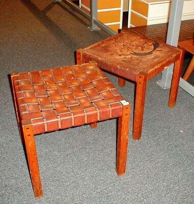 Each with square oak legs, visible mortise/tenon joinery, one with woven leather pad, the other of solid leather (stained), h: 17, 17.75 square in.