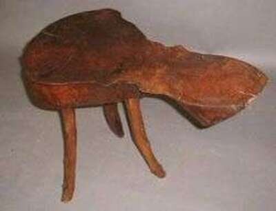 Of free-form design with slab top of carved tree crotch on three carved stick legs, h: 25, l: 28 in.