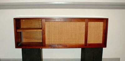 Of rectangular form with twin grasscloth covered sliding doors exposing a series of sliding shelves, stains to top, h: 19, w: 58, d: 14 in.