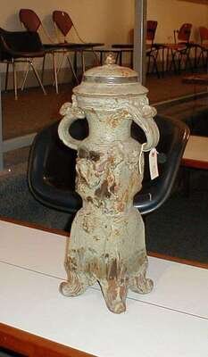 Twin handled, segmented form on scrolling feet with applied and incised decoration under a splashed on celadon glaze, h: 25 in.