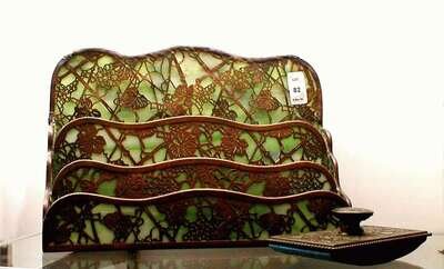 Grape vine pattern, includes a letter stand, a rocker blotter and an adjustable book stand, red/brown patina, all numbered and marked "Tiffany Studios, New York," letter stand repaired, height of letter stand: 8.75 in.