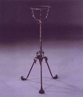 A basket-like cage decorated with serpents on a twisted shaft terminating in three reared serpents on flared legs with elf feet, stamped "SAMUEL YELLIN," h: 36 in.