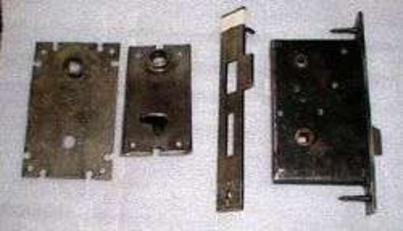 Consisting of four pieces: two door plates with Gothic motif, lock mechanism and lock facing plate, three pieces stamped "SAMUEL YELLIN".