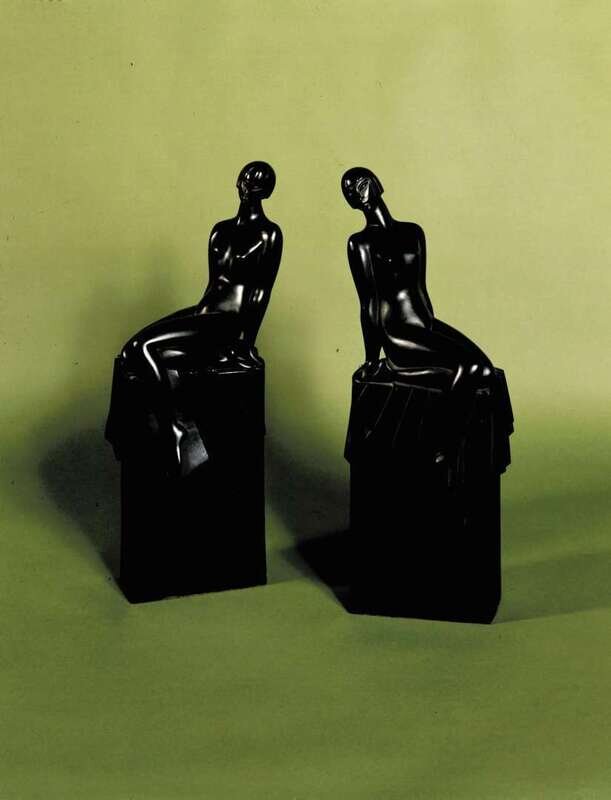 Each a female nude on tall sculpted base and facing opposite directions, signed "Sibylle. May 6" and "MADE IN FRANCE," h: 13.5 in.