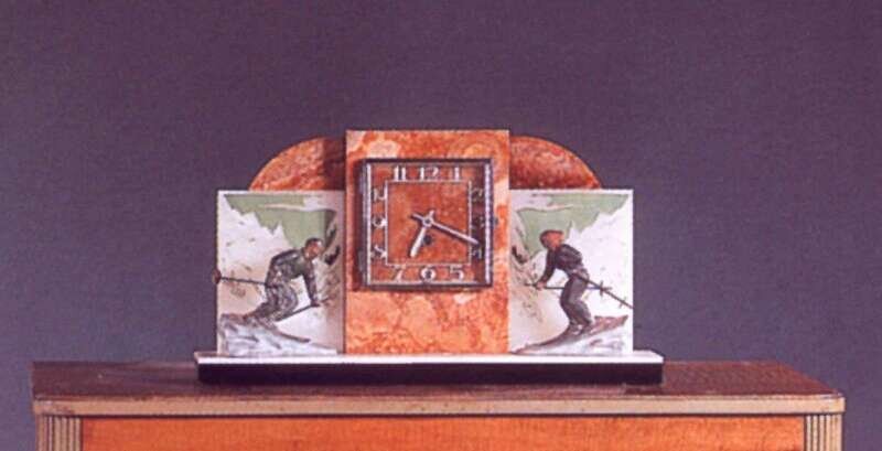 In three parts with clock and flanking bookends, of white and variegated pink marble on a black soapstone base; the white facings carved and colored with mountain and skiing motifs, white metal skiers flanking clock, minor nicks to corners, tiny repair to rear of one bookend, clock dimensions, h: 11.33, w: 21 in.