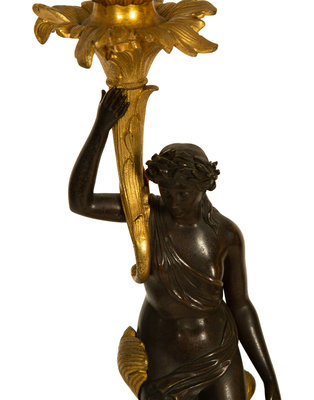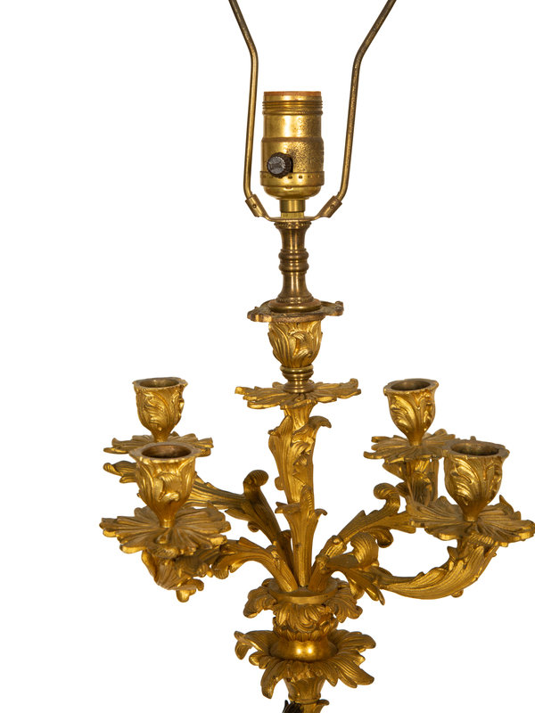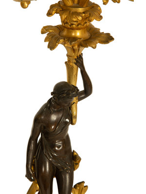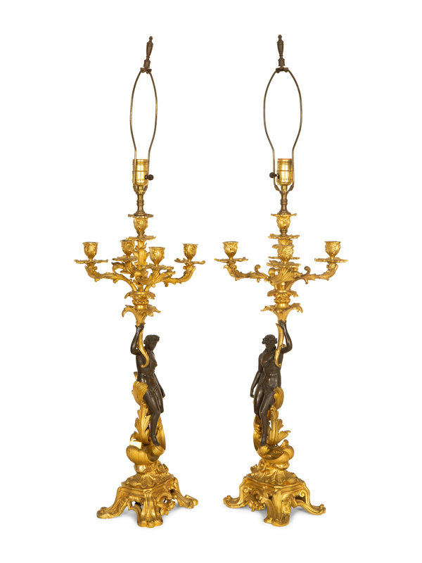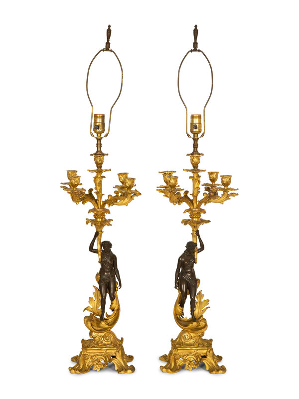 A Pair of Patinated and Gilt Bronze Figural Five-Light Candelabra Mounted as Lamps