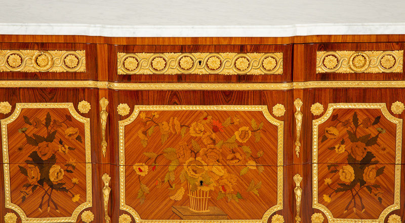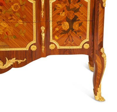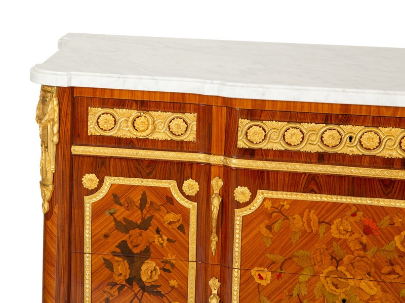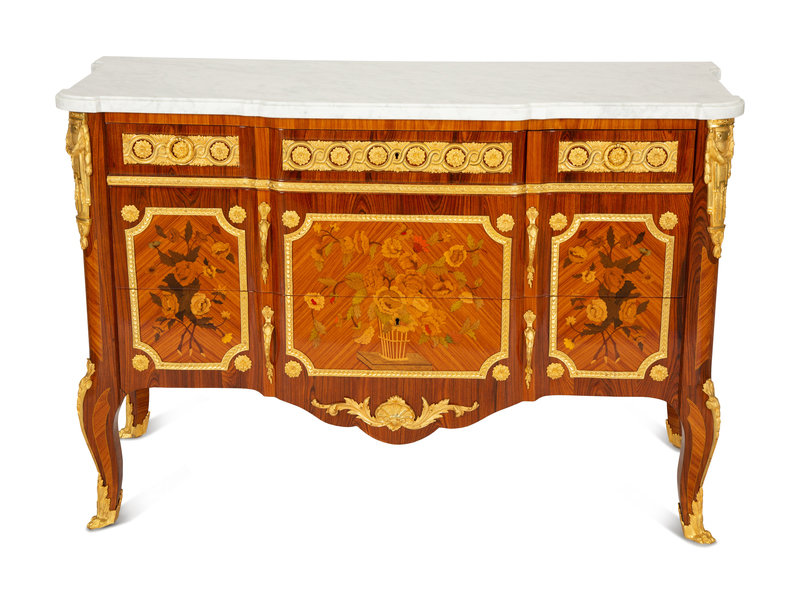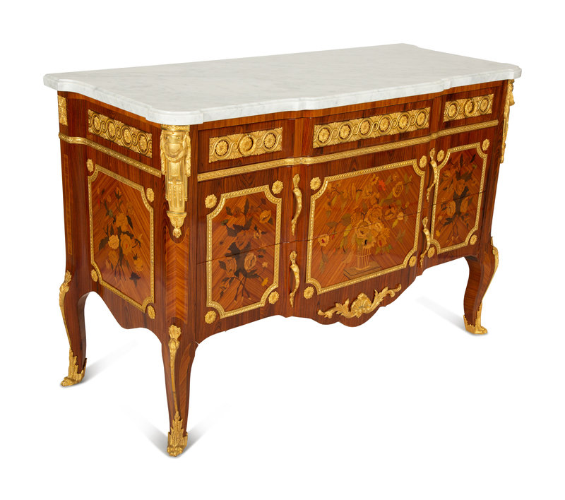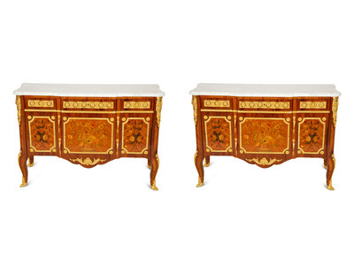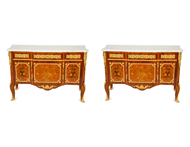 A Pair of Louis XV/XVI Transitional Style Gilt Bronze Mounted Marquetry Marble-Top Commodes