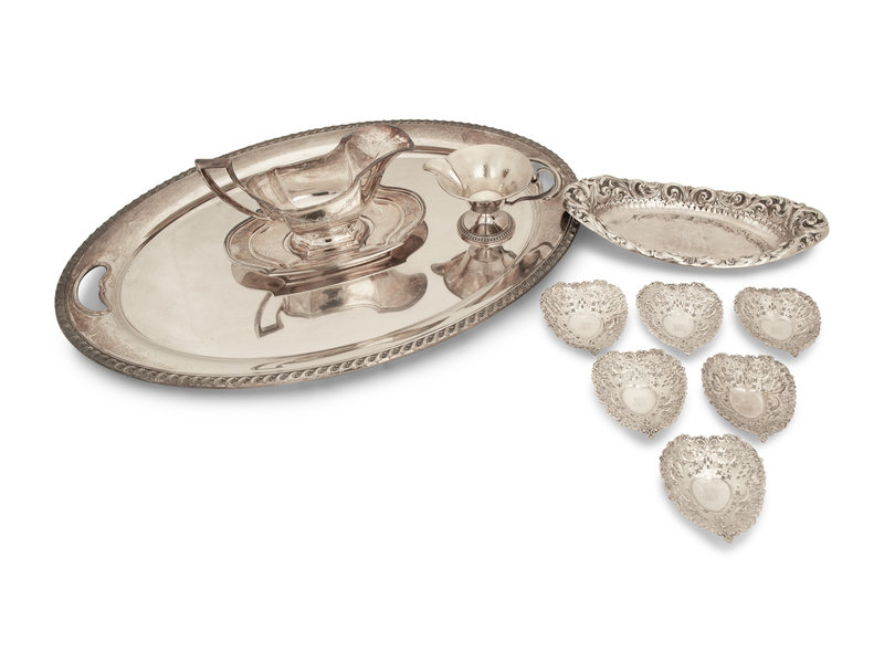 comprising a Gorham tray, a Bailey Banks & Biddle tray, a Tiffany & Co. cake server, a Gorham cake knife, a sauce boat and undertray by R. Wallace & Sons, a Tiffany & Co. inkwell, a wine coaster, four bowls of various sizes, six mint dishes, an oval dish, a flat serving spoon, and a pierced serving spoon; 20 items total.