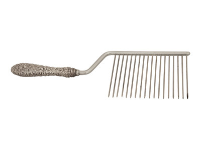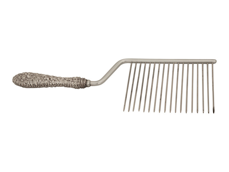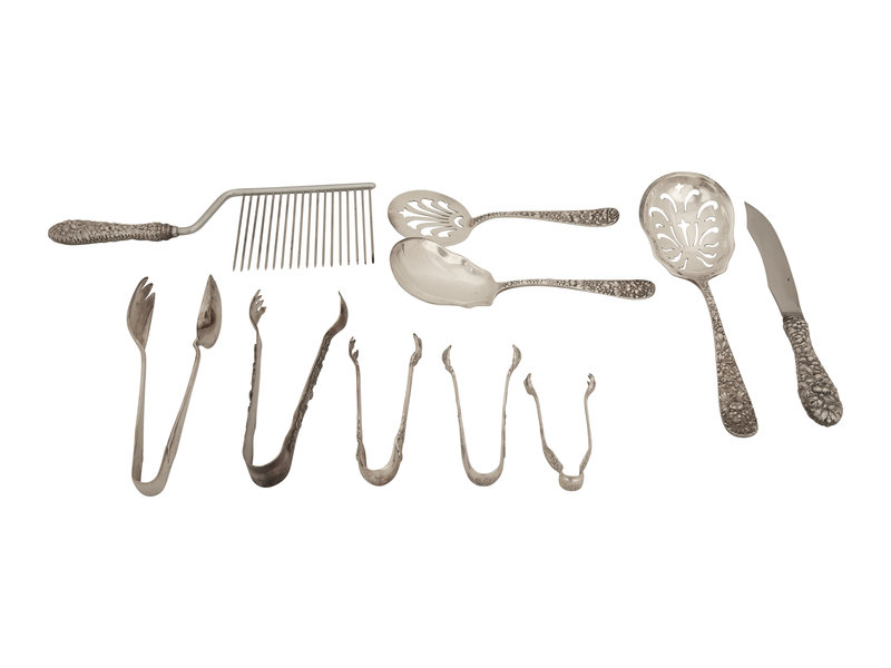 comprising an angel food cake slicer, a fish knife, a tomato server, a serving spoon, a slotted spoon, and five tongs; 10 items total.