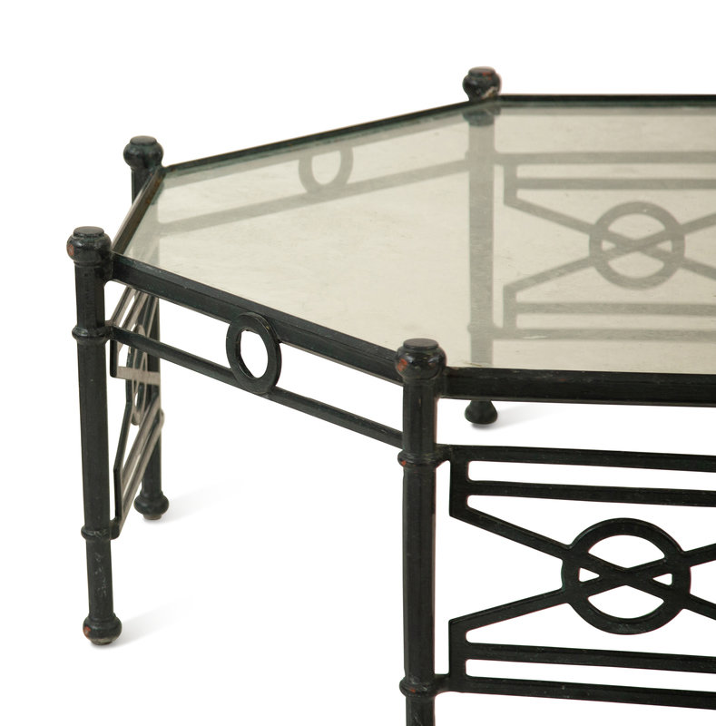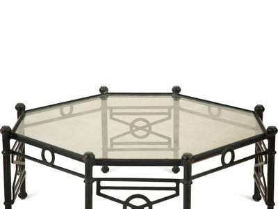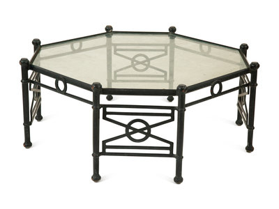 comprising an octagonal glass top low coffee table, a pair of square side tables, a pair of rectangular side tables and a pair of armchairs; seven pieces total.