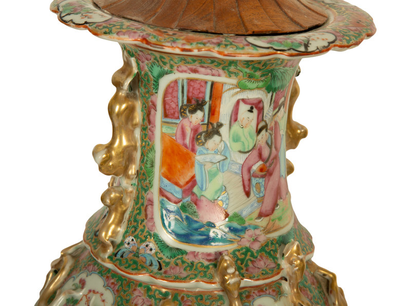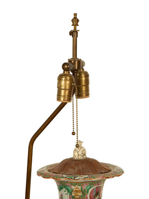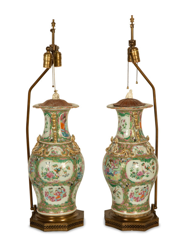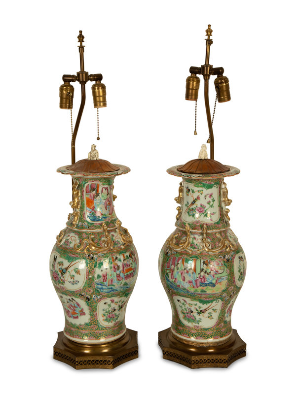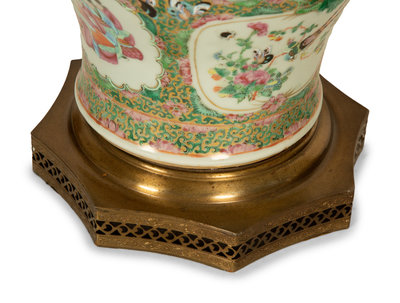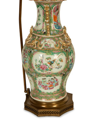 A Pair of Chinese Rose Medallion Porcelain Vases Mounted on Brass Lamp Stands