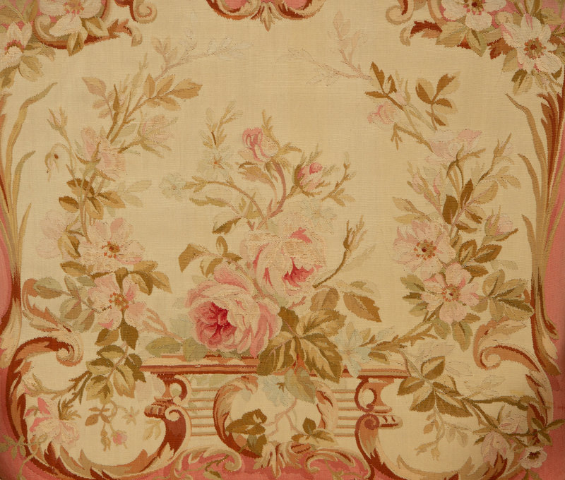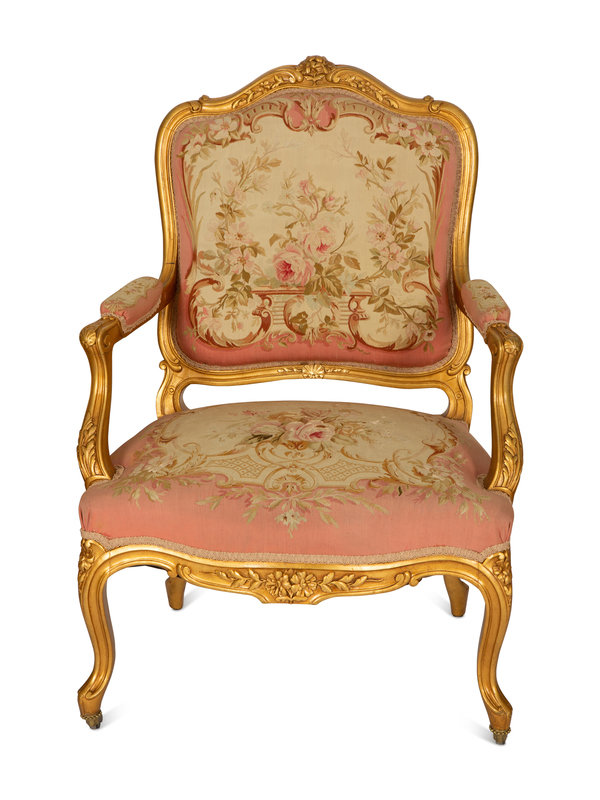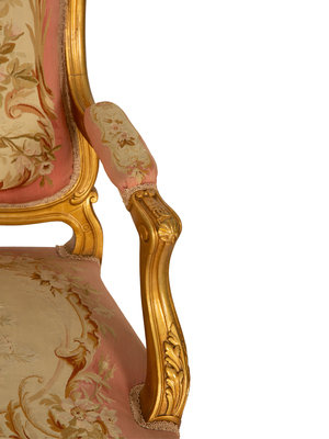 comprising a settee and a pair of fauteuils, each upholstered in Aubusson tapestry.